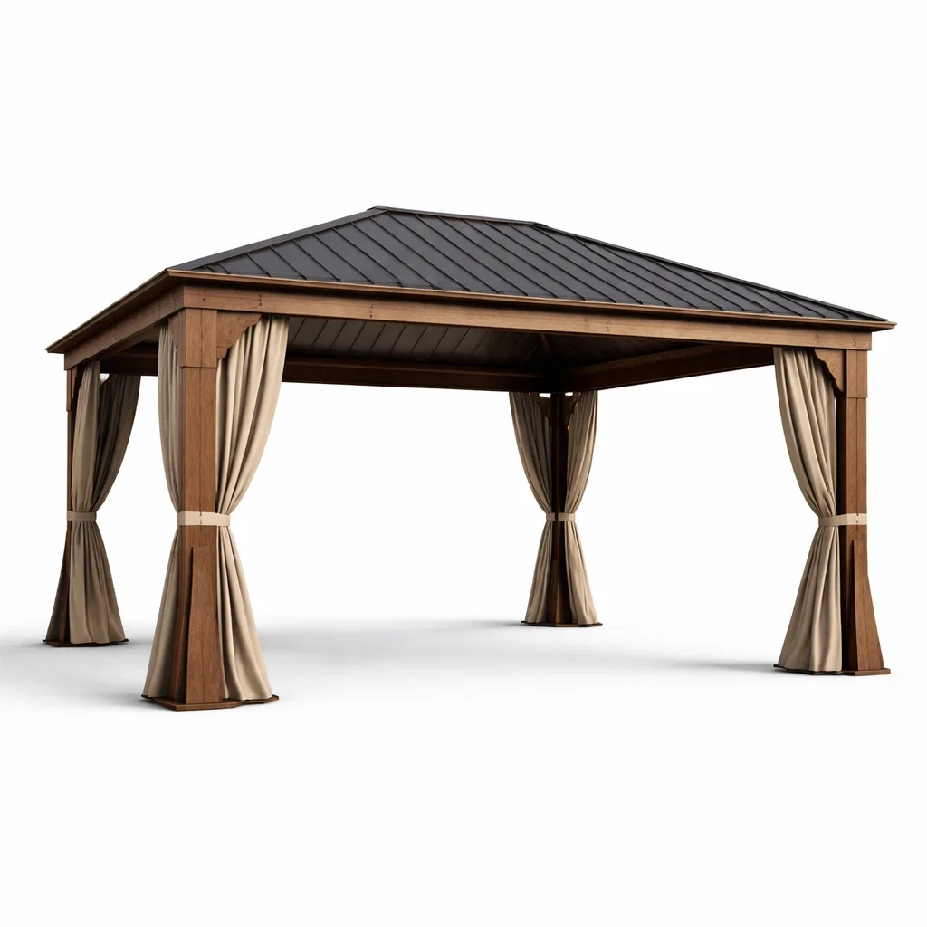 Gartenpavillon aus Lärchenholz mit Metalldach und Polyester Vorhängen