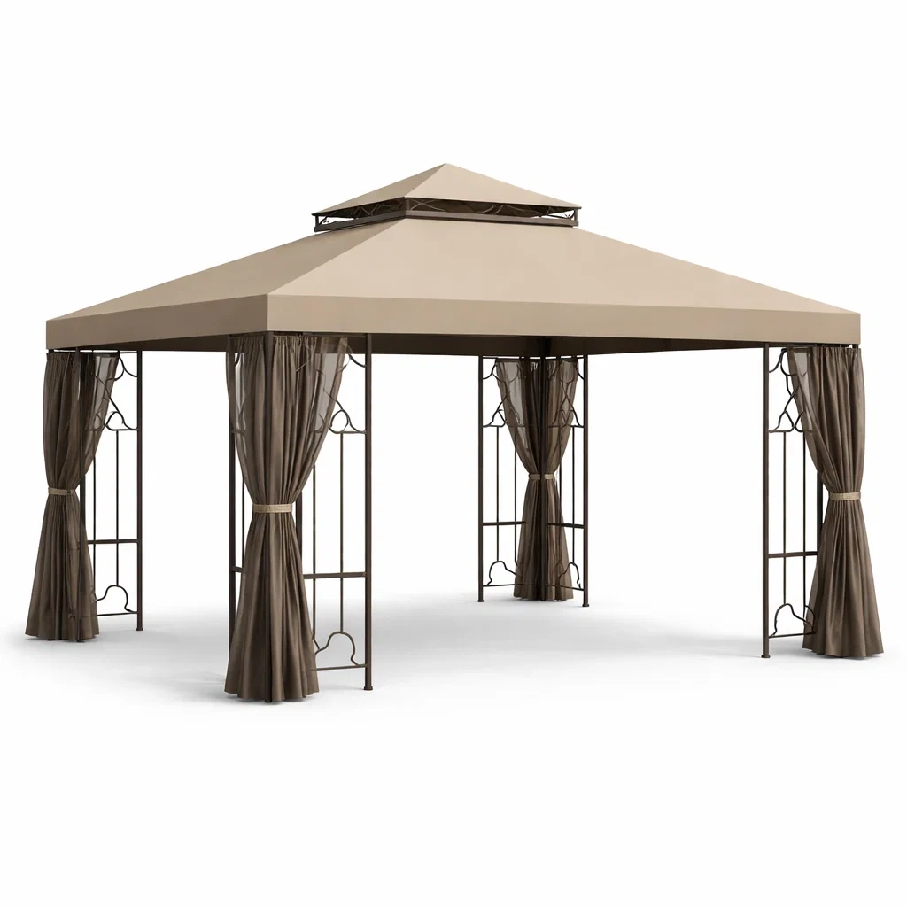 Der Pavillon wird mit 8 Stützpfosten und 4 Vorhängen geliefert. Die Hauptfarbe des Pavillons ist Beige. Das Gesamtgewicht beträgt 30 kg.